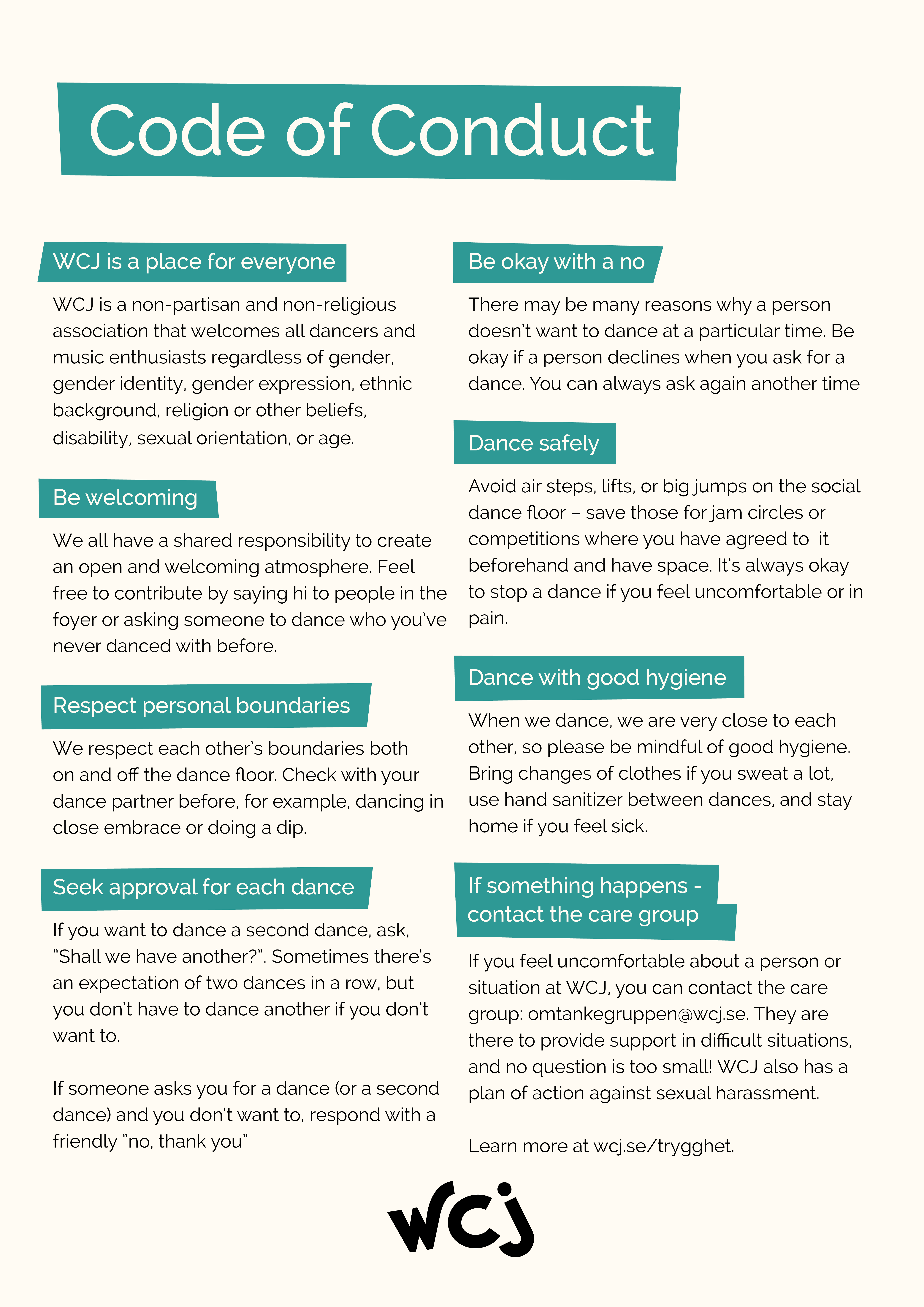 Vi har ett gemensamt ansvar för att skapa en öppen och välkomnande atmosfär. Bidra gärna genom att heja på folk i foajén eller bjuda upp någon som du inte dansat med förut.